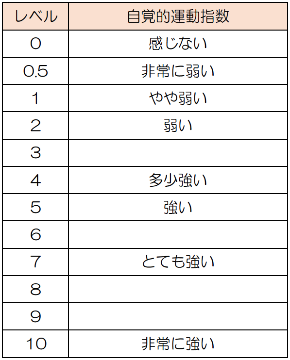 運動強度を表す指標として使用することが多いのが修正Borgscale(自覚的運動指数)です。人により運動のキツさの感じ方には違いがあります。この修正Borgscaleは運動した時のつらさを0~10の数で表し標準的にしたものです。