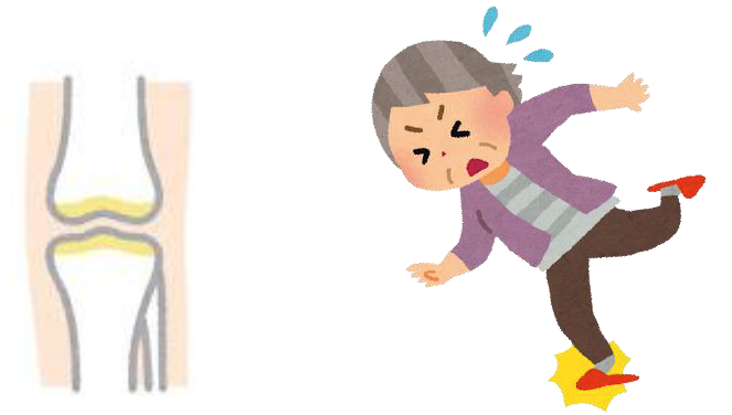 転倒する危険性が高い高齢者が有する疾患の一つに,変形性膝関節症が挙げられます。近年の疫学研究によると、日本の75歳以の一般高齢者を対象とした調査において、膝の痛みが強くなるほど転倒および股関節周囲の骨折リスクが上昇すると報告されています。厚生労働省の国民生活基礎調査報告によれば、転倒・骨折は要介護状態となる要因の上位に位置付けられており、高齢者の転倒は重要な社会問題となっております。変形性膝関節症は進行性の疾患であり、我慢しても膝の変形が改善することはありません。重症化する前に医師に相談することが重要です。