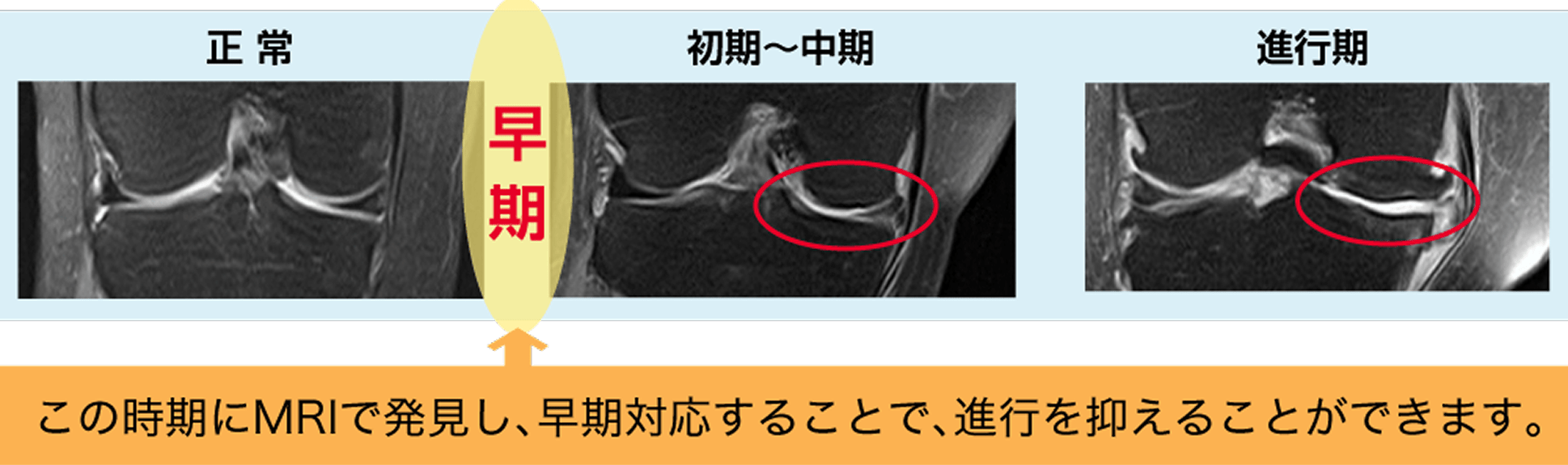 早期の変形性ひざ関節症は、レントゲン画像だけでは見つからない場合があります。MRI検査なら可視化されない初期変化を捉えることが可能です。