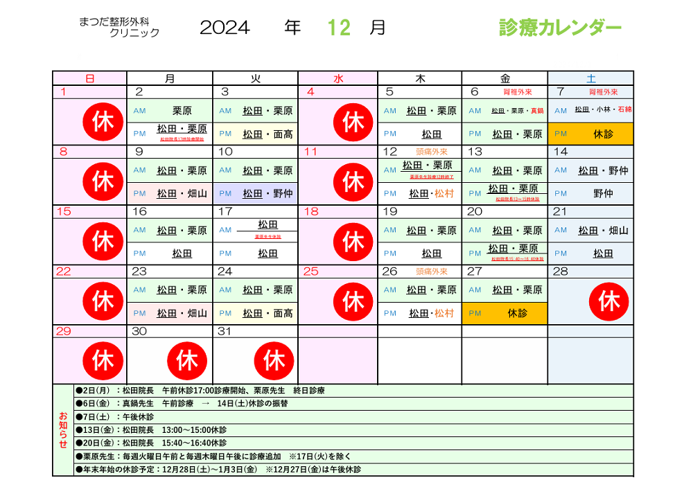 お知らせ一覧へ 2024/11/30 12月の診療予定について 12月の診察予定について 以下の通りお知らせいたします。 前の記事へ 次の記事へ 監修医師について まつだ整形外科クリニック院長 松田芳和日本整形外科学会認定専門医 日本スポーツ協会認定専門医. 難病指定医 まつだ整形外科クリニックはひざの再生医療をはじめました 日帰り注射だけで完結する新しいひざの治療法「ひざの再生医療」を全国的に先駆けて導入しました!詳しい治療法や料金をご覧いただけます。