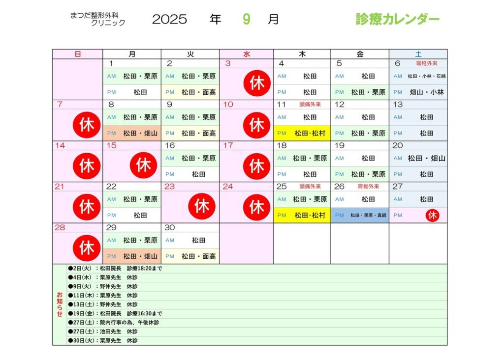 お知らせ一覧へ 2025/08/29 9月の診療予定について 診療案内 お知らせ 9月の診察予定について以下の通りお知らせいたします。 前の記事へ 次の記事へ 監修医師について まつだ整形外科クリニック院長 松田芳和日本整形外科学会認定専門医 日本スポーツ協会認定専門医. 難病指定医 まつだ整形外科クリニックはひざの再生医療をはじめました 日帰り注射だけで完結する新しいひざの治療法「ひざの再生医療」を全国的に先駆けて導入しました!詳しい治療法や料金をご覧いただけます。